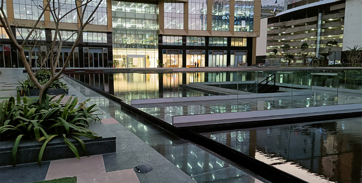 The dated appearance of this corporate park will soon be transformed with a sleek international urban statement. The new landscape plan includes a grand water plaza at the centre of the campus, reflecting the signature tower being designed by RBTA for the new extension center. This thoughtfully designed landscape will serve as a green oasis, enhancing the campus commons with microclimate comfort.