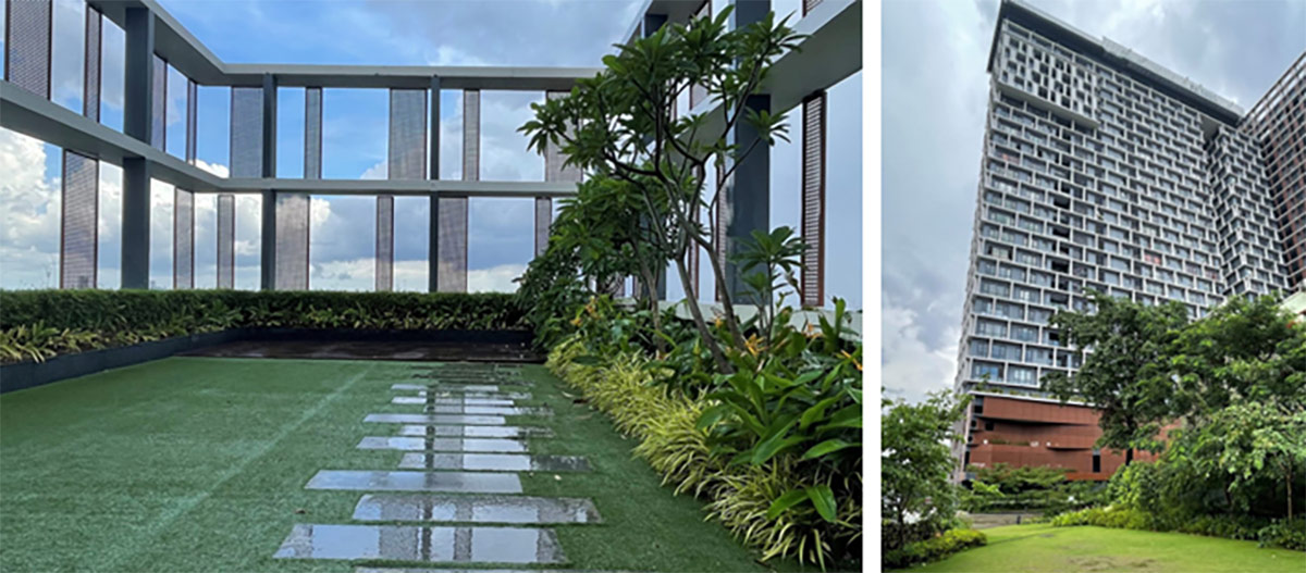 The development features a grand entry plaza with a central, tall- framed structure that houses the security cabin. Multipurpose sports courts, an infinity pool, tiered parking, and a children's play area have all been thoughtfully planned and strategically located. Additionally, a complete lifestyle zone on the 24th-floor terrace provides spaces for swimming, recreation, relaxation, and entertainment.