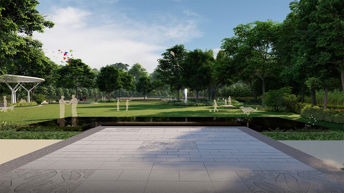 A clear jogging loop encircles the central open ground, weaving through multiple pause points and amenities. The vista opens up with engaging landscape features: art walls, circular huddle zones, a ring pavilion, sports corners, fitness corners, and interactive pockets. A series of floral sweeps enhances the experience, with species that bloom across the year. Bespoke elements and intricate attention to detail make the park unique and experiential.