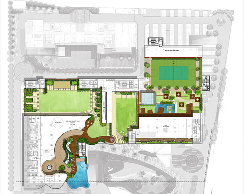 The office and hotel landscapes are spread across multiple terraces and gardens, featuring floating infinity pools, event banqueting spaces, a grand gallery lawn, wedding lawns, play courts, private garden terraces, and many more captivating corners.