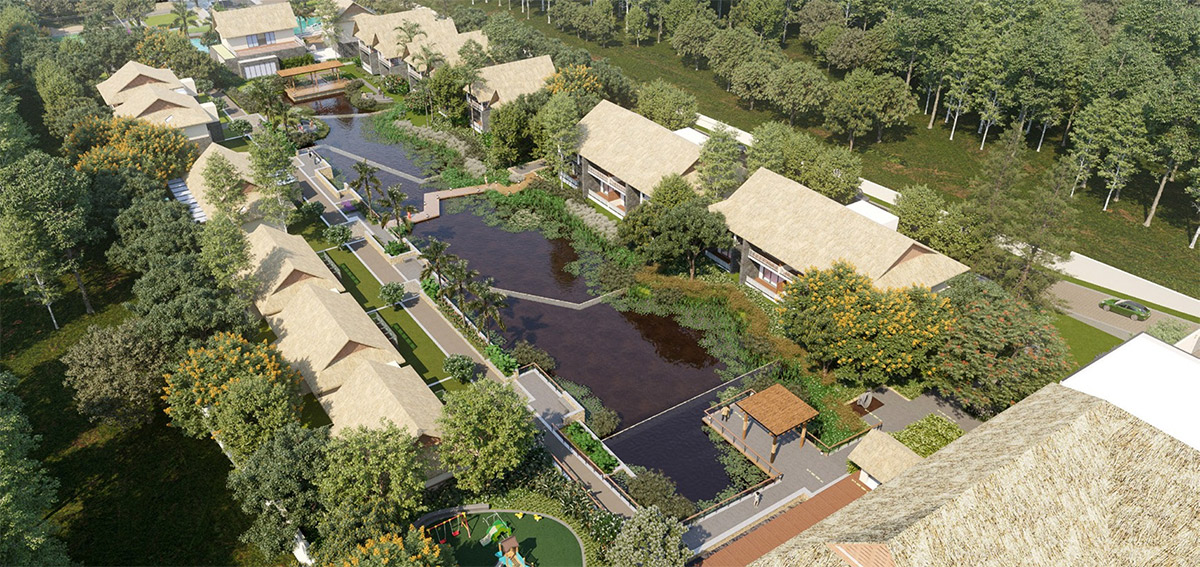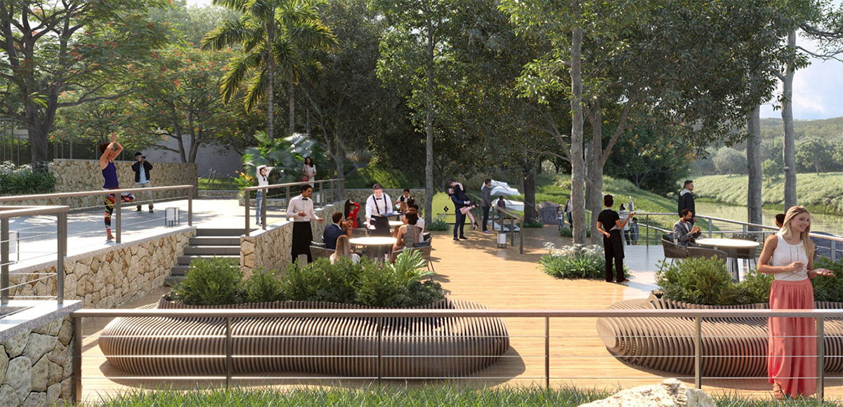 The recreational zones and landscape amenities extend across the length of this linear property, which already benefits from existing clusters of mature trees. Outdoor cabanas, decks, and camping zones cascade down the natural slope toward an active stream, creating a dynamic and immersive outdoor lifestyle.