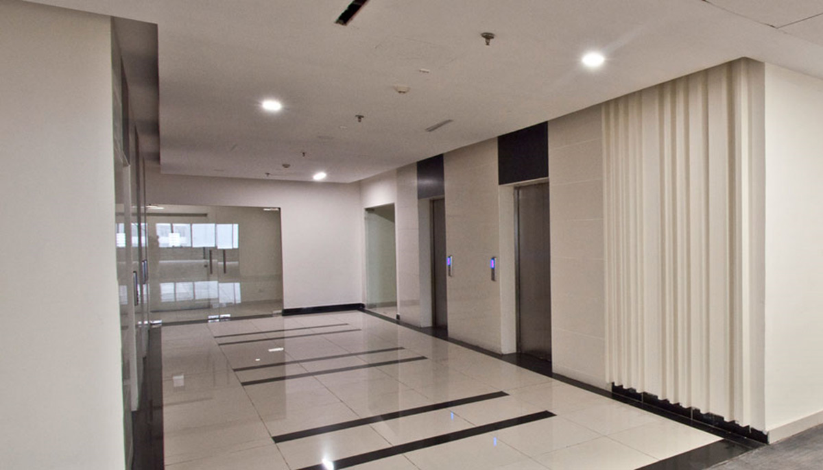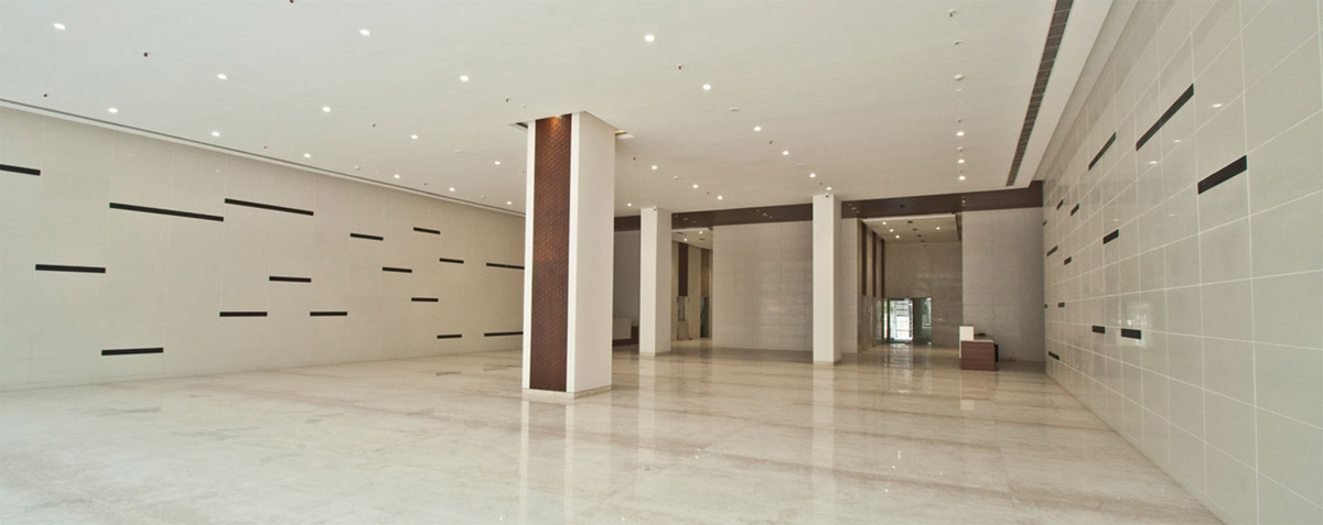 The modern and elegant design of the common areas of these two corporate towers leads to a creative work environment and inspires innovation, with a dash of handcrafted burnt solid wood & veneer paneling on the columns amidst the white sheathe common to the main entrance lobby and subsequent lift lobbies on all floors adding charm and sophistication to the scheme. The light tone of interiors is complemented by the playful staggering of leather finish black granite on the walls which enhances the futuristic look and tone of the theme.