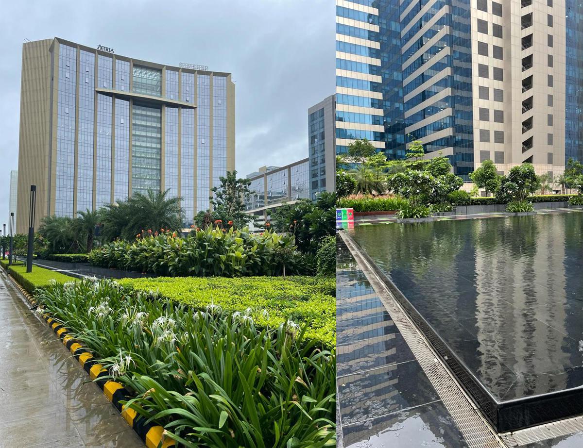 The dated appearance of this corporate park will soon be transformed with a sleek international urban statement. The new landscape plan includes a grand water plaza at the centre of the campus, reflecting the signature tower being designed by RBTA for the new extension center. This thoughtfully designed landscape will serve as a green oasis, enhancing the campus commons with microclimate comfort.