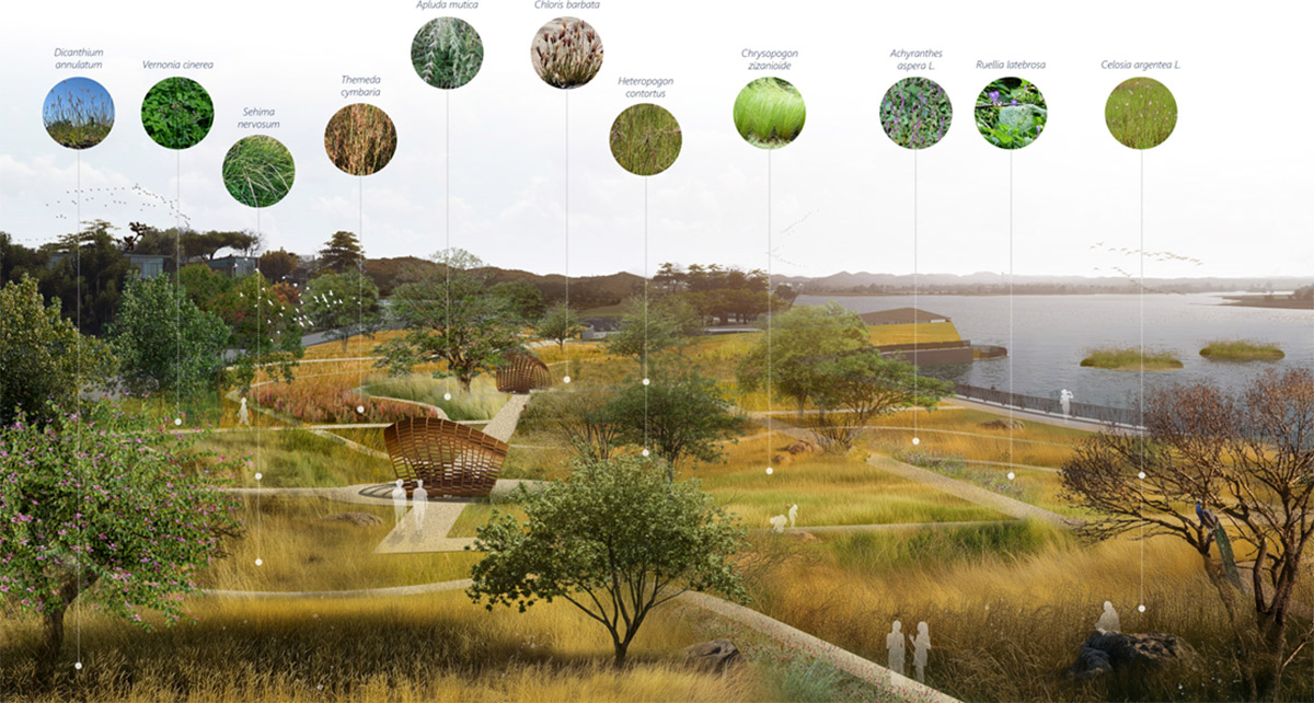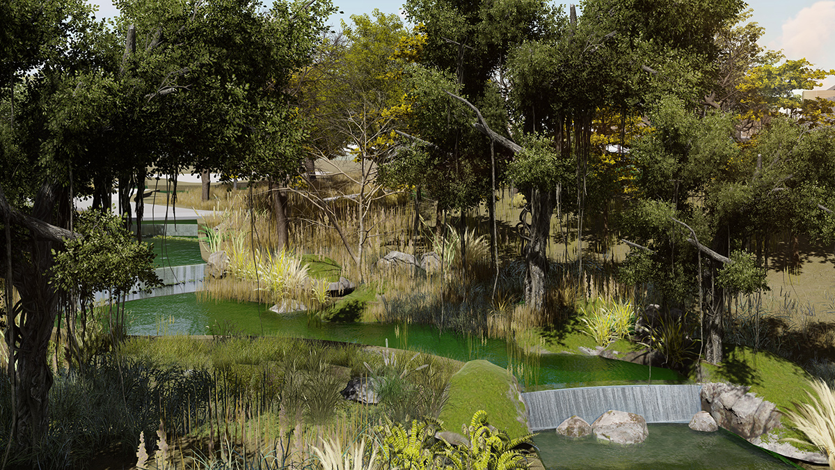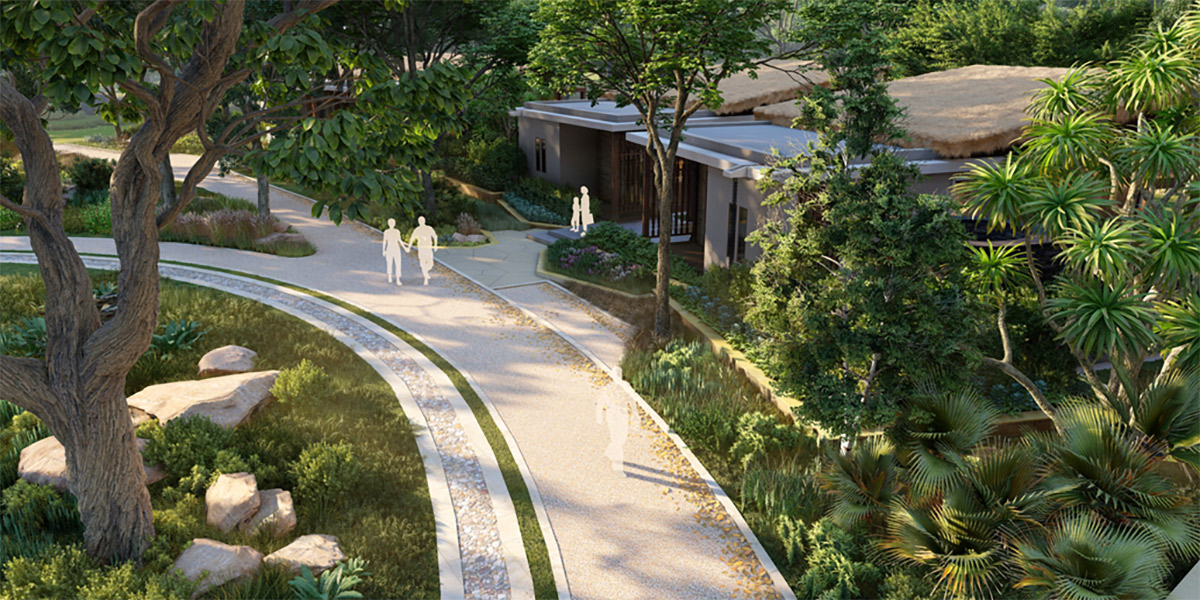 Perched almost like an island, this land parcel is surrounded by a large lake inhabited by crocodiles. Design Accord, in collaboration with Designers Group Architects, envisions extending the forest ecology with cottages nestled amidst dense native trees, savannah-like grasslands, and lagoon pools.