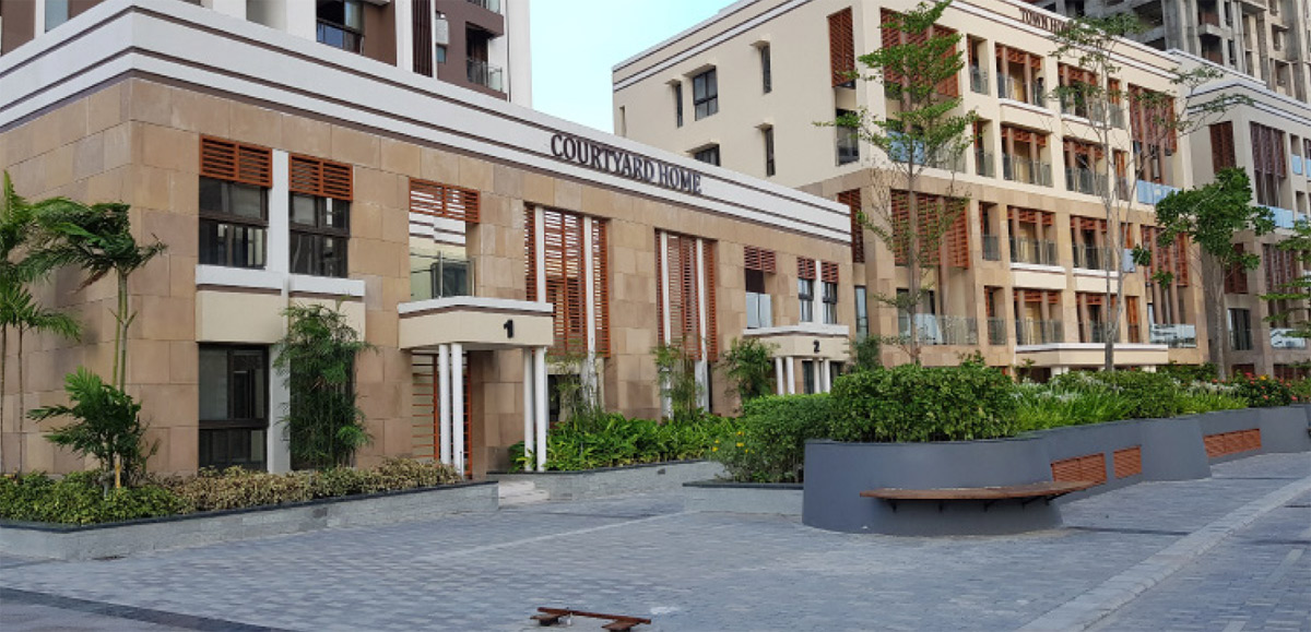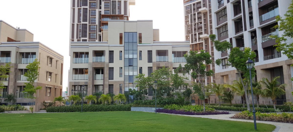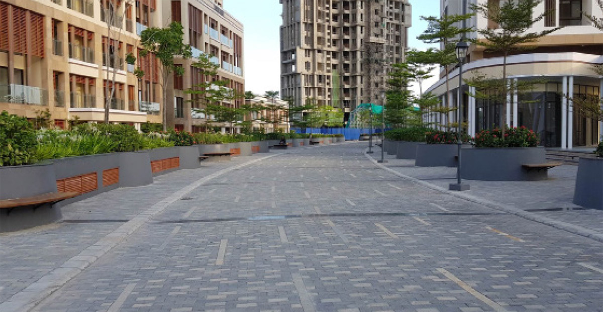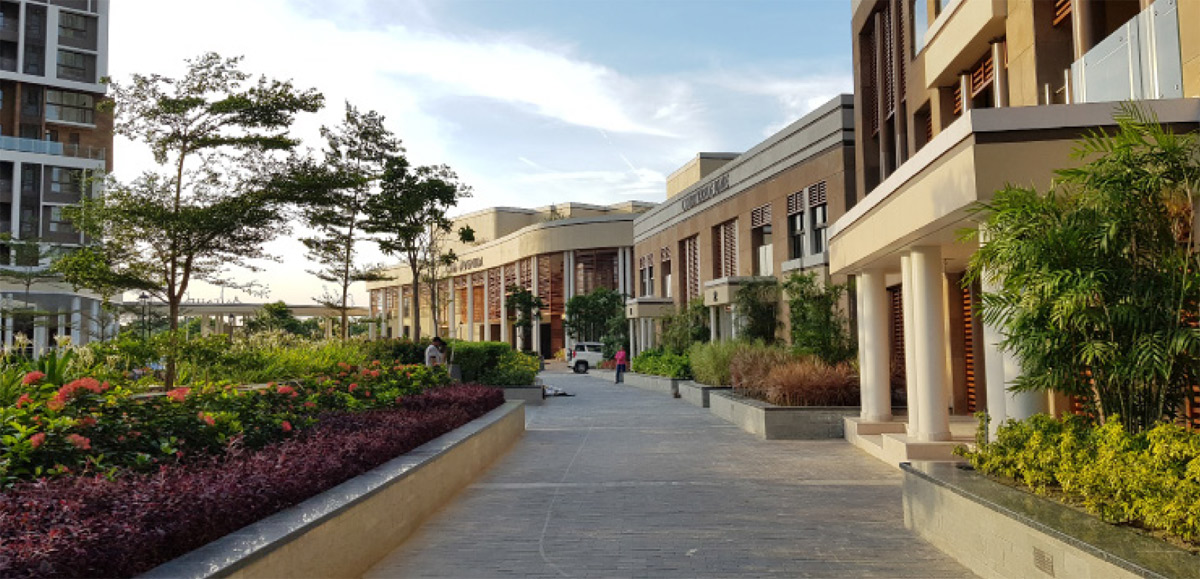 Inspired by the architecture of old Kolkata and the city's cultural context, this contemporary landscape setting offers a range of outdoor spaces, from the grandeur of a large arrival area to a small, cozy nook in the rear gardens. The landscape design also features a wide urban avenue as a central spine, which flows into podiums and club gardens, resplendent with rich tropical planting.