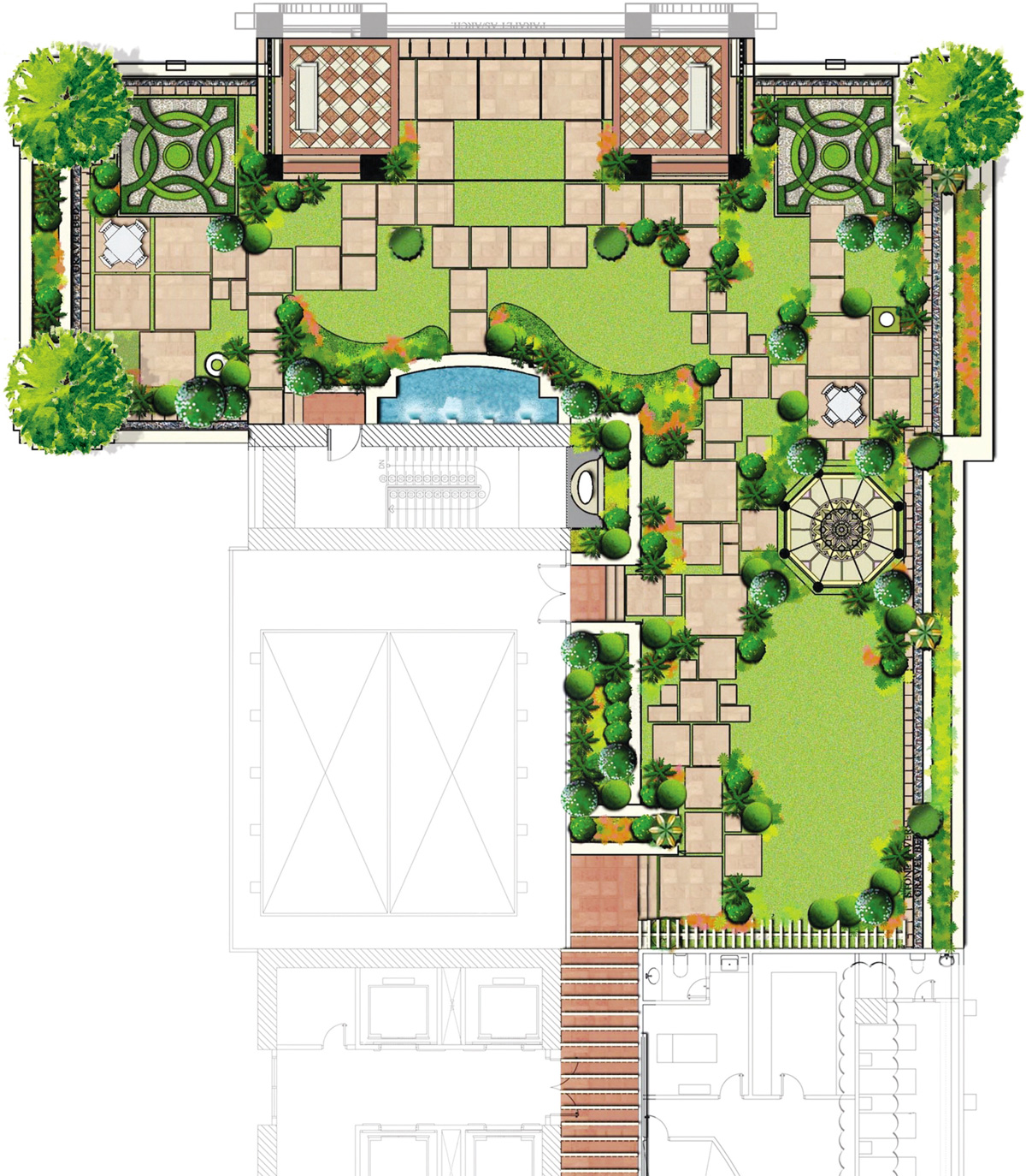 With its distinct European touch, the hotel exudes exclusivity and style, starting with the arrival experience at its ground level. The rich cobbled drive-in porch, the soothing sound of water overflowing from a stone-cut urn, and carefully selected exotic plants wrap the space in elegance. The landscape unfolds across multiple levels of the tower, including the 8th, 27th, 48th, and 53rd floors, culminating in a grand European-style terrace designed for the penthouse. The intricate motif design of the pool, complemented by a classical semi-circular arbor, stone-cut pottery, and elegant outdoor furniture, offers a truly rejuvenating experience. Atop the terrace, an elaborate English garden—with classical cabanas, an observatory point, water spouts, and a vibrant palette of plantings—creates a sense of being literally on top of the world.