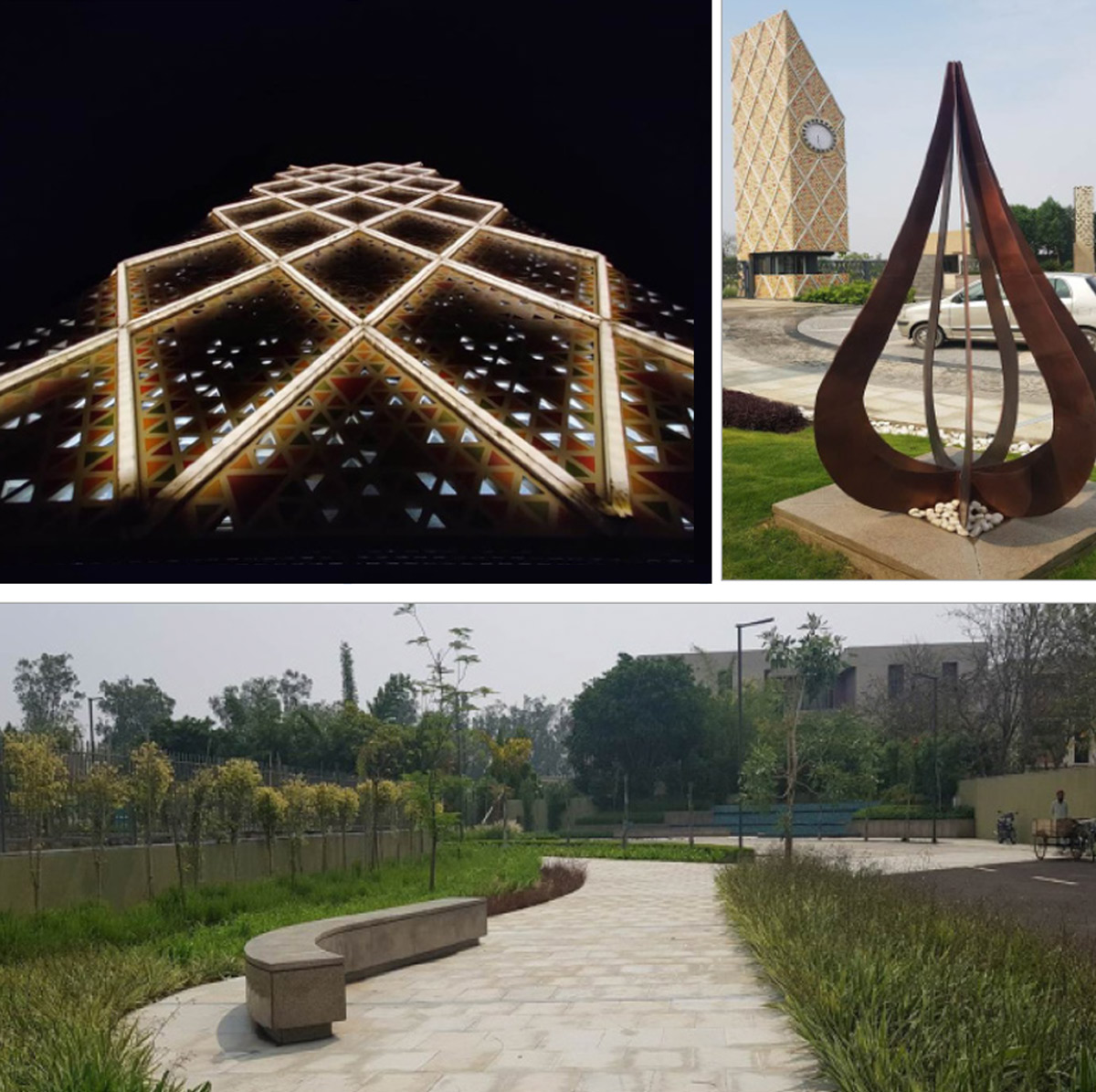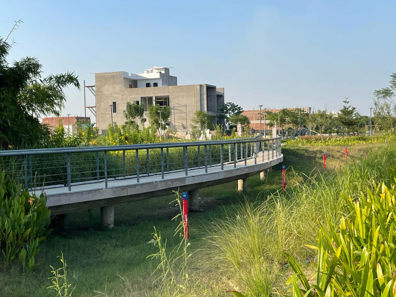A unique aspect of this campus is its stormwater management system. The entire drainage is naturally integrated through bioswales along the length of the linear greens, channeling water to a sunken area that can hold excess water during the monsoon and also serve as a playground year-round. This is a one-of-a-kind design where 99 acres have been planned to sustain well without the need for a stormwater pipeline.