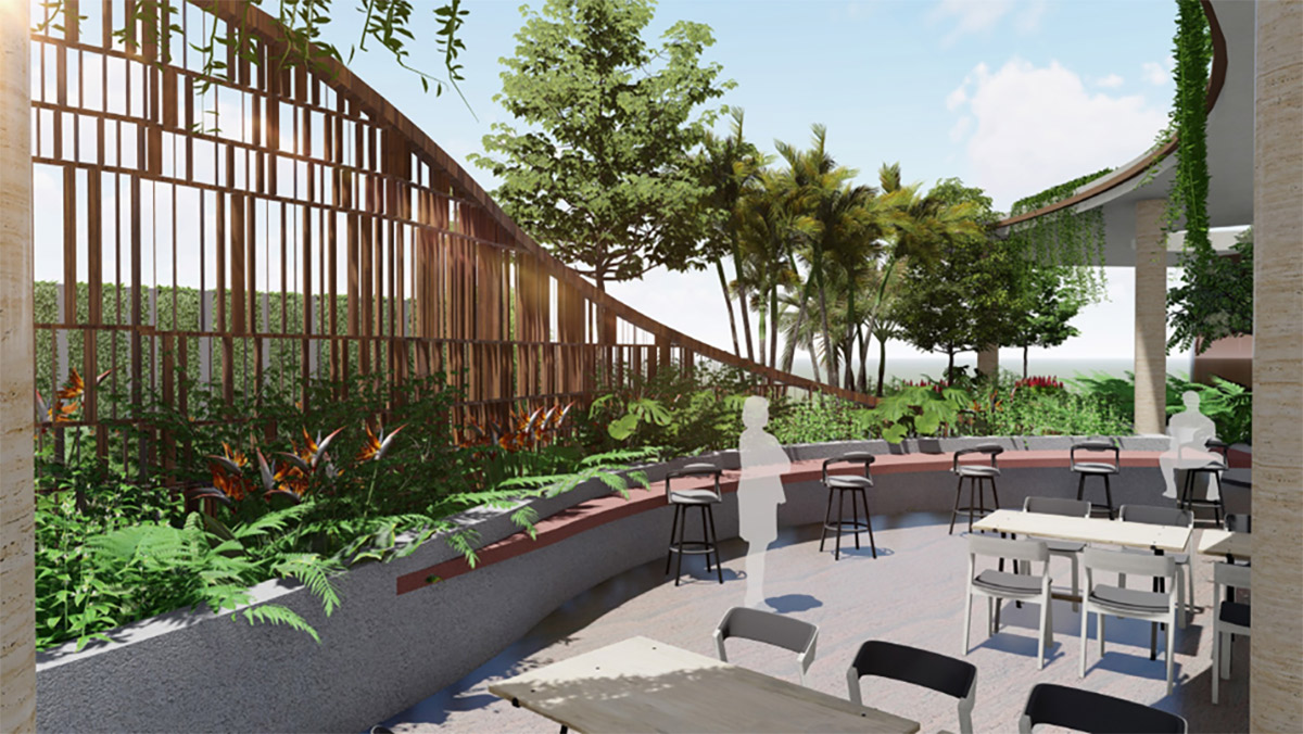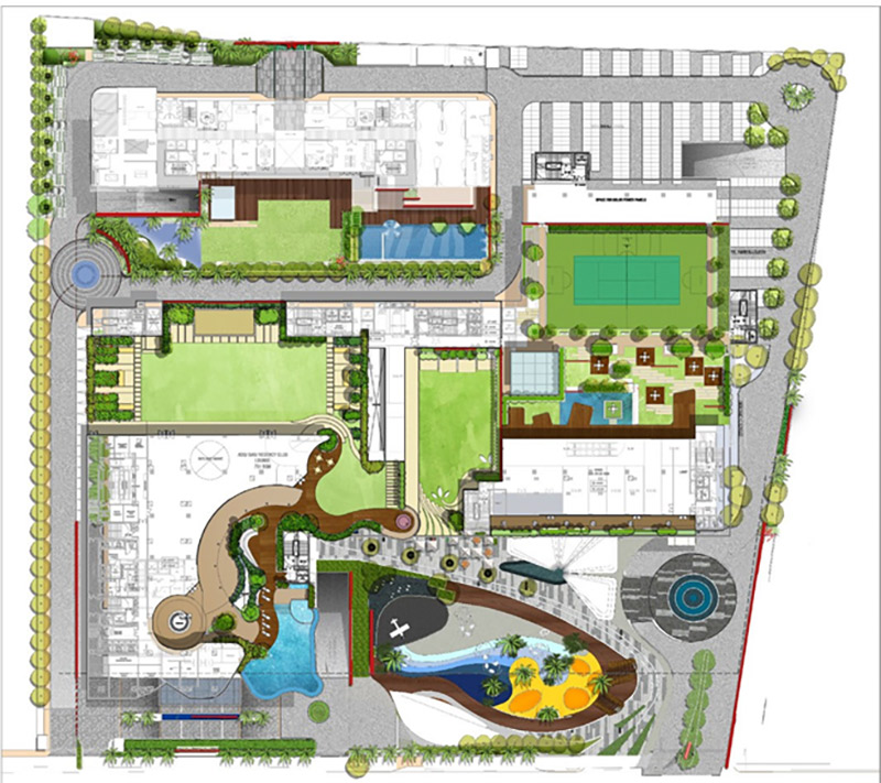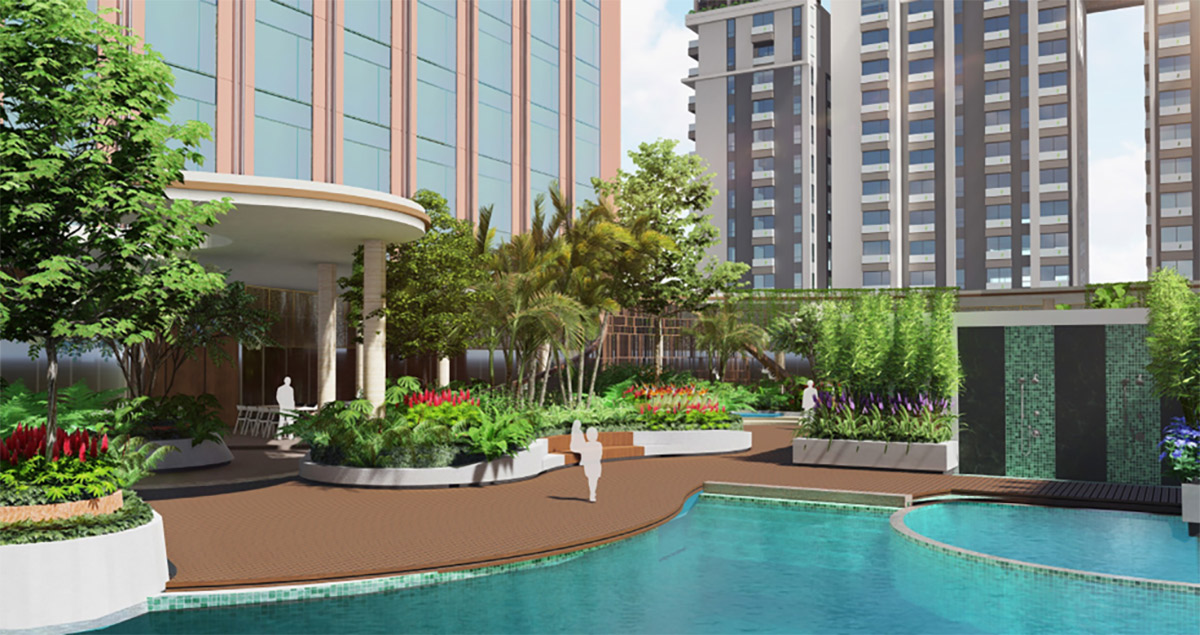 The office and hotel landscapes are spread across multiple terraces and gardens, featuring floating infinity pools, event banqueting spaces, a grand gallery lawn, wedding lawns, play courts, private garden terraces, and many more captivating corners.