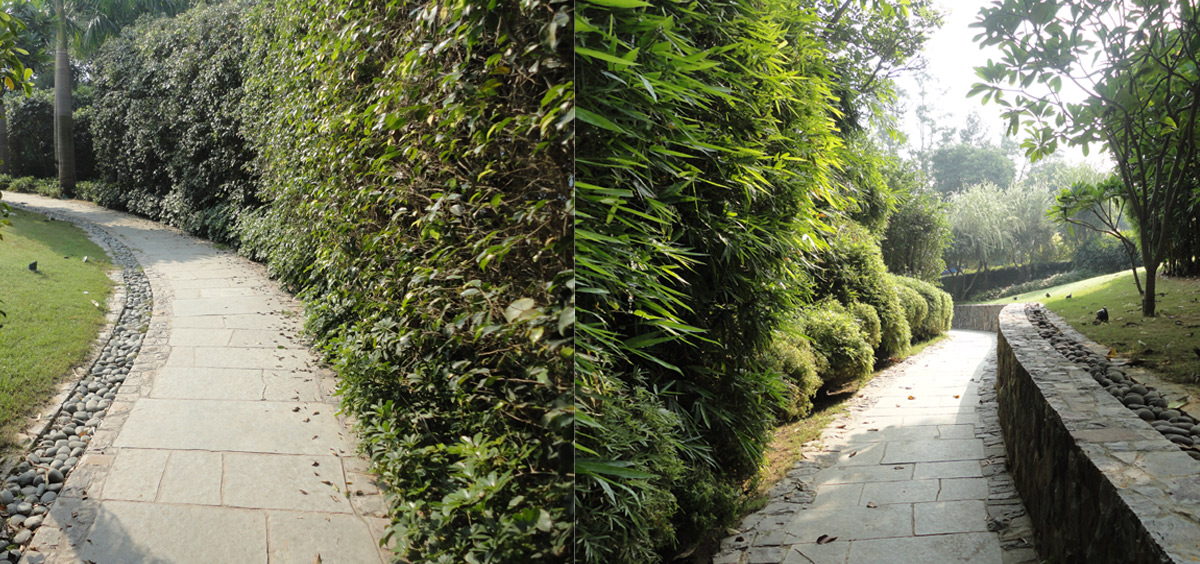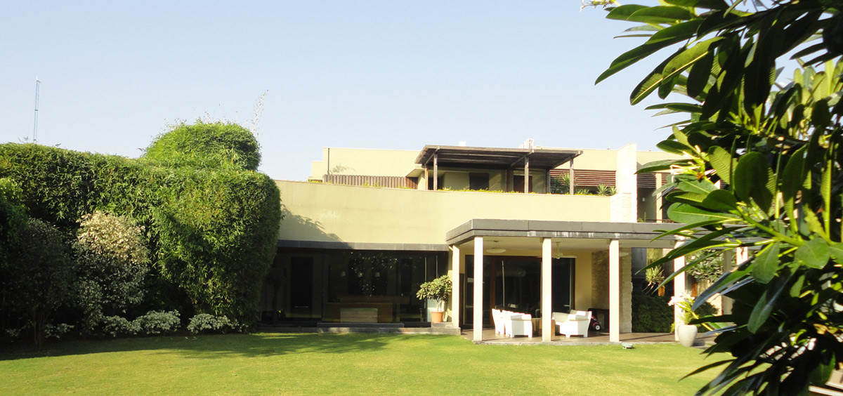 An unpredictable, dense mix of large plants, palms, winding pathways, random rubble masonry walls, and unique sculptures distinguishes this rustic tropical oasis from other farmhouses in the densely populated area of Chattarpur, New Delhi. A significant portion of the built surfaces and courtyard walls is wrapped in earth mounds.
