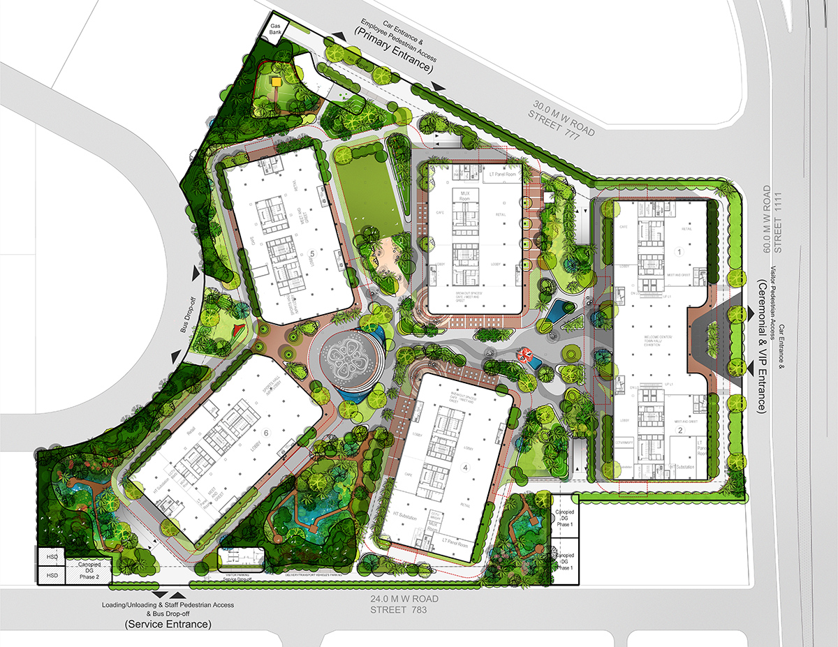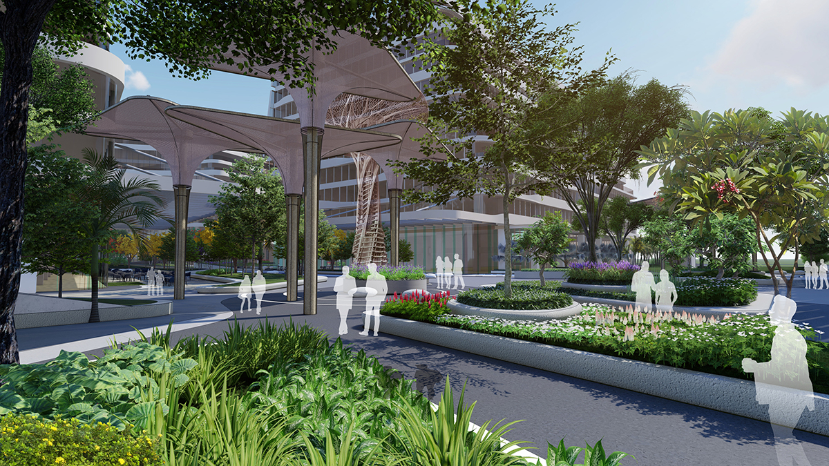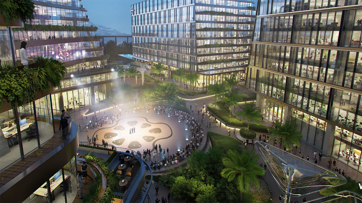 Design Accord has expanded upon the original vision conceived by Woods Bagot to create a complete biophilic setting for this unique IT Park campus being developed in Kolkata. All the towers face the central plaza spine, which will serve as the lifeline of the campus. This pedestrian-friendly zone connects the north and south blocks, dotted with large trees and bespoke canopies.