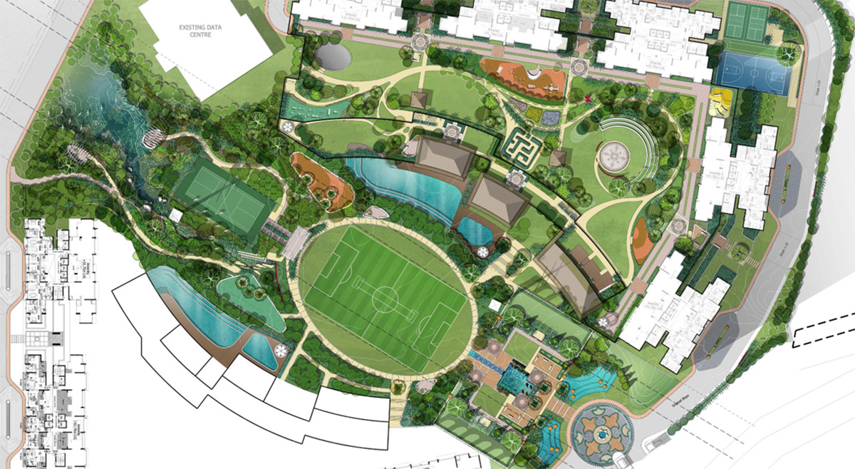 The design introduces a green continuum across staggered podiums, culminating in the largest podium, which serves as the main amenity space for residents. This central space, located under a high-tension line, restricted built structures, leading to the creation of a large central oval ground—a versatile play zone. Beyond this, tennis courts and other amenities are provided.
