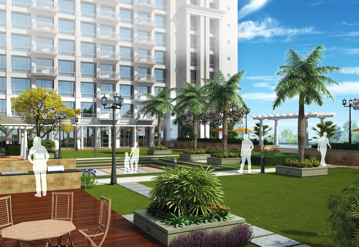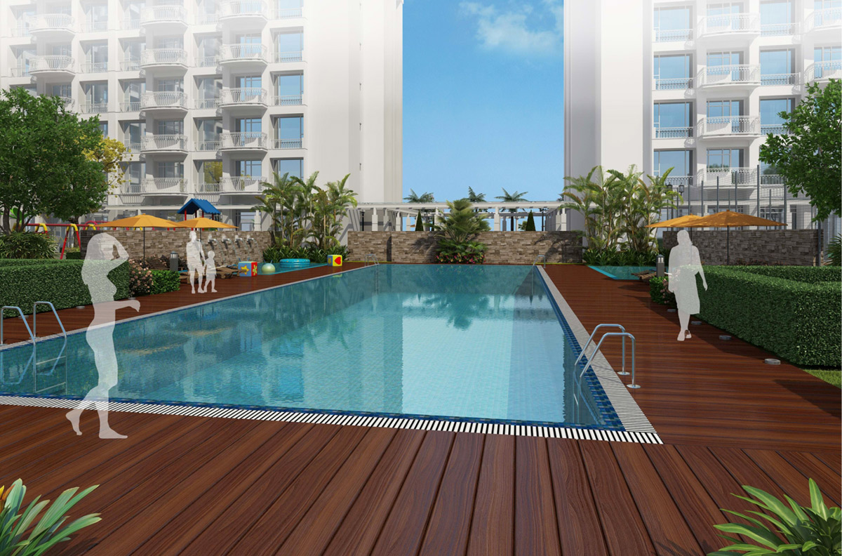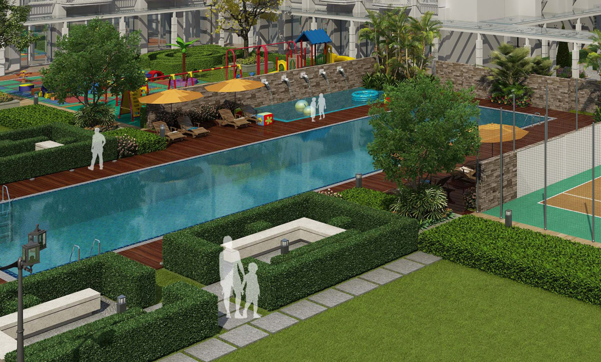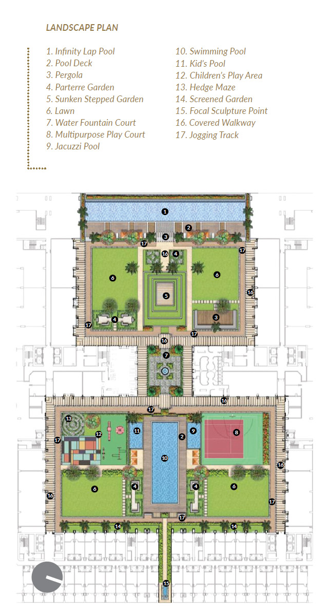 Two swimming pools are part of the design — a fifty-meter-long infinity lap pool with a glass ledge facing the bay and a family pool in the internal court of the podium, accompanied by a children’s pool, sports amenities, jogging loops, a fitness garden, and a belvedere court. A senior citizens’ garden, community recreation areas, and outdoor gathering spaces are spread across the podium level, while the ground level is busy with an arcaded retail walk and promenade